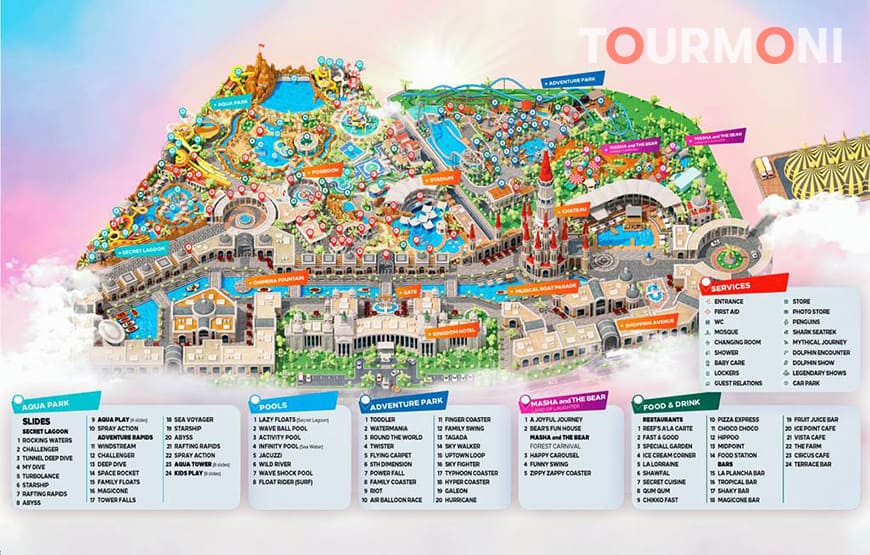 Территория парка отлично размечена, а персонал, говорящий на турецком, английском, немецком и русском языках, всегда готов помочь. Спасатели и технические службы ежедневно проверяют исправность горок и чистоту бассейнов. Ваша безопасность — главный приоритет, поэтому людям с проблемами со здоровьем (сердце, шея или спина) рекомендуется воздержаться от экстремальных аттракционов.